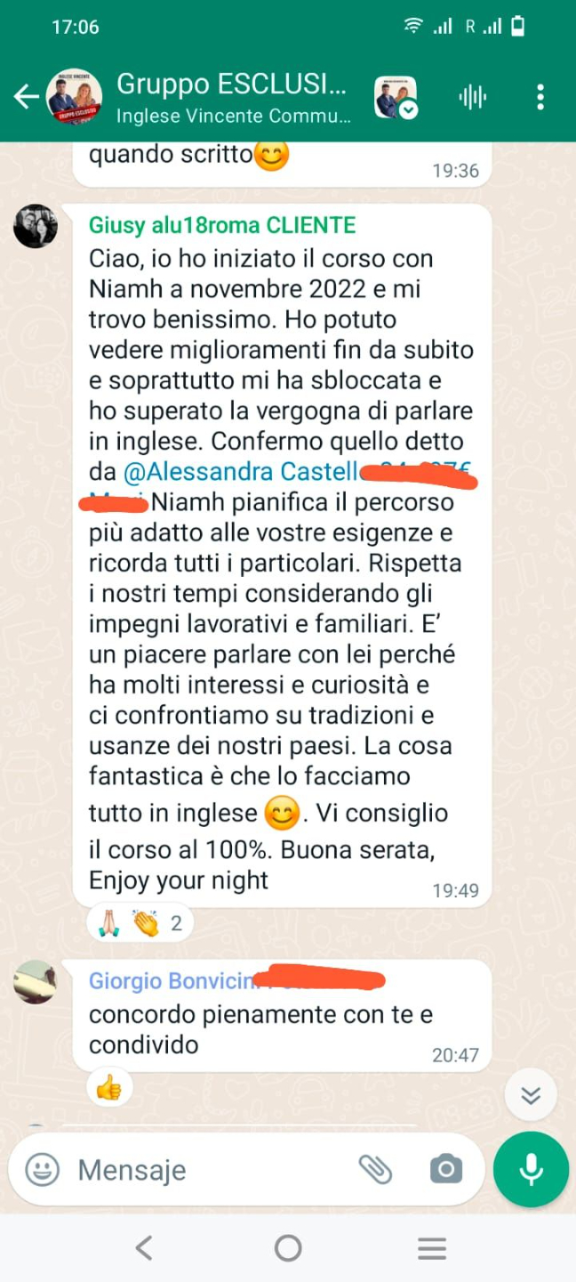 Il corso di Mattia e Niamh, mi sta aiutando ad avere il giusto approccio verso la lingua. Prima perdevo tempo con la grammatica ma sono cose che nella realtà non servono. Io ho bisogno di parlare d capire. Con questo corso mi sto ritrovando, nel senso che miglioro settimana dopo settimana.