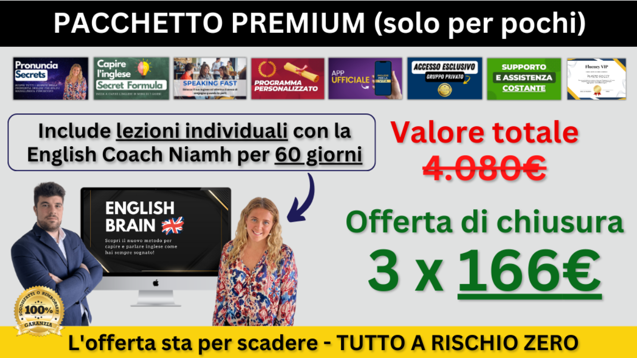 ✅ Percorso privato di 60 giorni con la English Coach madrelingua Niamh per imparare a conversare con sicurezza (lezioni individuali, valore 1.200€)