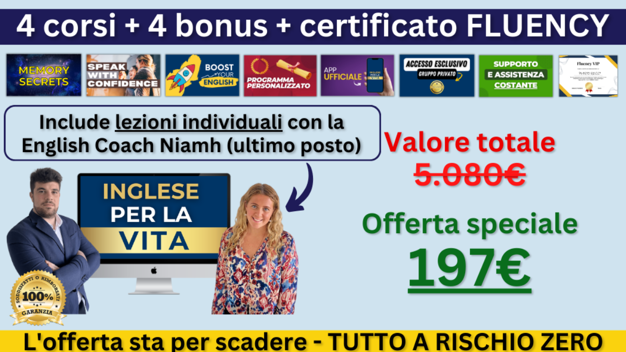 ✅ Percorso privato di 30 giorni con la English Coach madrelingua Niamh per imparare a conversare con sicurezza (lezioni individuali, valore 1.200€)