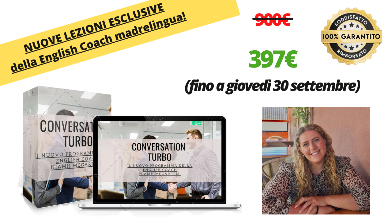 PS: Le 4 lezioni incluse nel pacchetto TURBO PREMIUM saranno LIVE e converserai in inglese direttamente con Niamh. Stai tranquillo e non ti spaventare, Niamh ti metterà subito a tuo agio e ti stupirai dei miglioramenti rapidi che otterai.