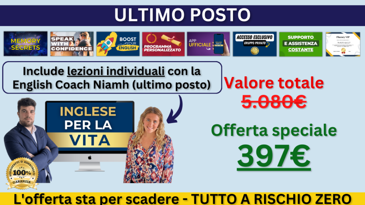 ✅ Percorso privato di 30 giorni con la English Coach madrelingua Niamh per imparare a conversare con sicurezza (lezioni individuali, valore 1.200€)