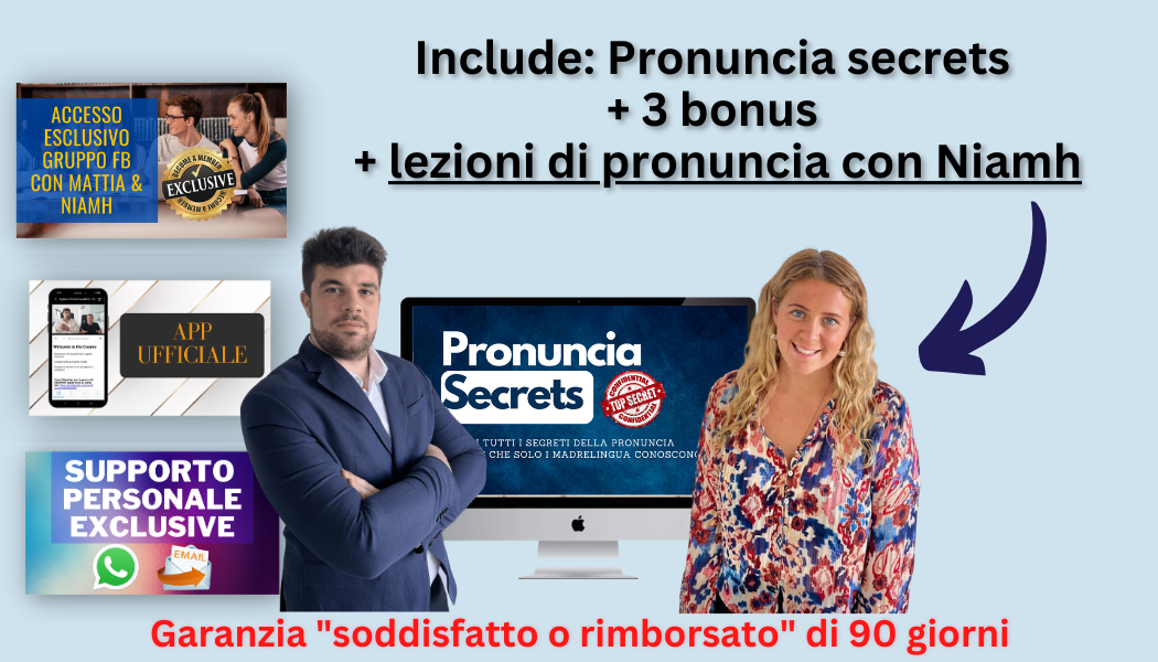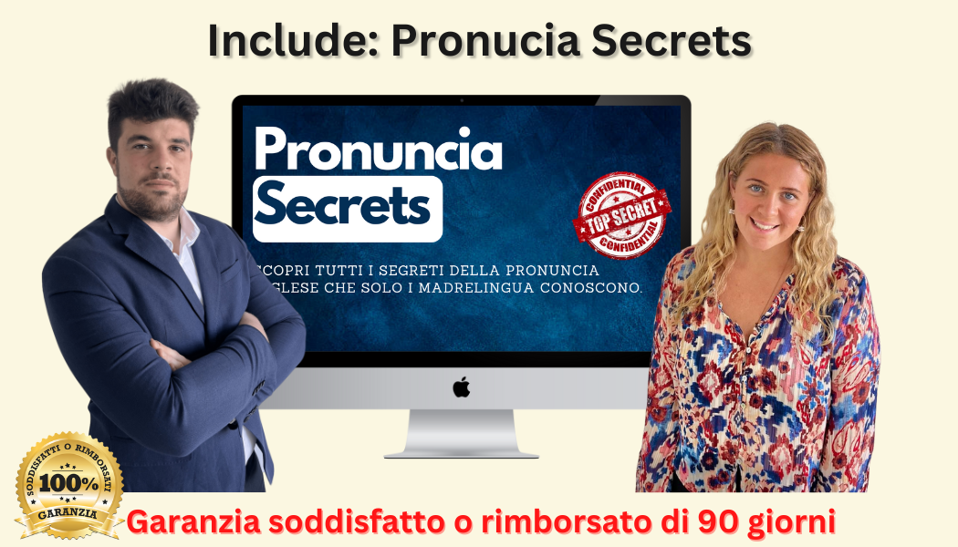 Scopri come ottenere la PRONUNCIA PERFETTA da fare invidia ai tuoi amici, in sole 4 settimane, grazie al nuovo corso "Pronuncia Secrets", che contiene tutti i segreti mai rivelati che solo i madrelingua conoscono.
